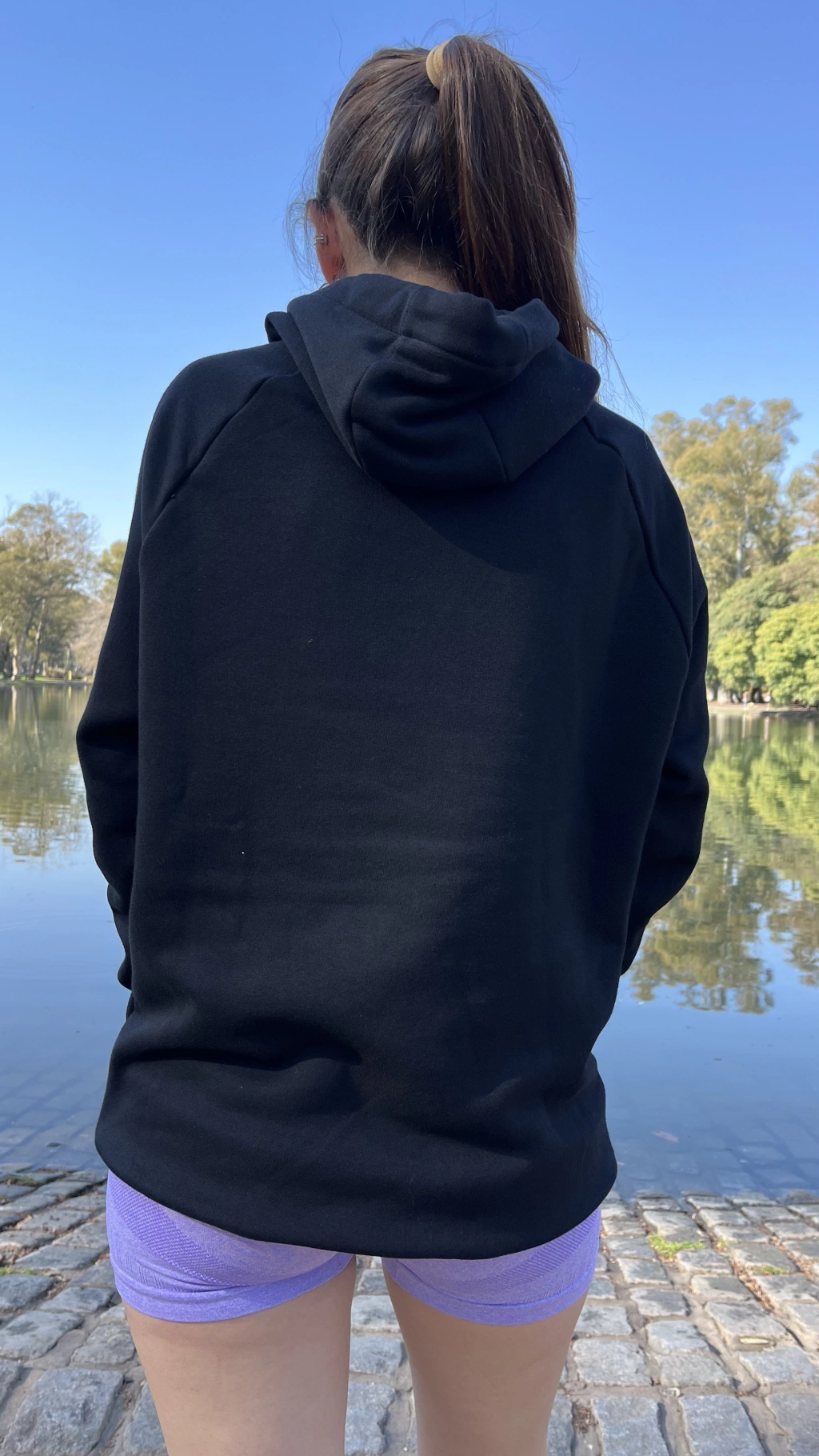 Color negro, holgado, con capucha y tiras regulables, bolsillo cómodo y amplio tipo "canguro", confeccionado con 100% algodón y friza por dentro. Es super suave al tacto para que puedas estar cómoda en todo momento. Puede usarse directamente arriba del top, con calzas, joggers o jeans. ¡Probalo y no vas a parar de usarlo!